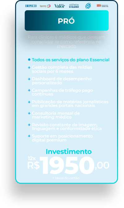 Nosso time é composto por mais de 34 profissionais multidisciplinares das áreas de saúde, marketing, tecnologia, comunicação e negócios. Criamos um sistema próprio de marketing e estratégia digital, desenvolvido internamente, que acelera o crescimento sustentável de nossos clientes em até 6 meses.